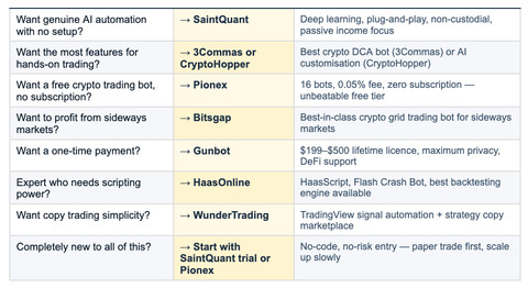 There's a spectrum from fully hands-off (SaintQuant, Pionex) to highly manual (HaasOnline, Gunbot). If you're busy and want automation to genuinely handle trading for you, start with SaintQuant or Pionex. If you enjoy building and testing strategies, 3Commas or CryptoHopper will reward your involvement.