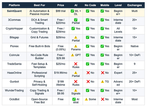 The best crypto trading bot in 2026 for most people — especially beginners — is SaintQuant. It uses genuine machine learning and deep learning to trade automatically across major exchanges, 24/7, with zero coding required. If you want more manual control or cheaper entry points, 3Commas, CryptoHopper, and Pionex are excellent alternatives. Full rankings and comparisons below.