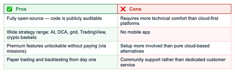 For users who want to self-host their bot and verify exactly what it's doing with their capital, OctoBot is the most trustworthy free option available. Paper trading and backtesting are available from day one, making it a solid learning environment before deploying real funds.