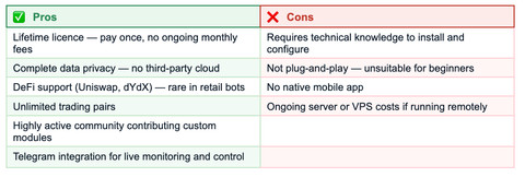 The DeFi tier extends this to decentralised exchanges like Uniswap and dYdX — a rare capability among mainstream trading bots. For developers, if you know JavaScript, you can code virtually any strategy you can conceive. The community is active and contributes custom modules, bug fixes, and strategy templates regularly.