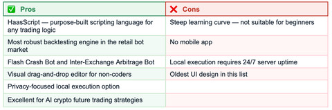 Specific bots worth noting: the Flash Crash Bot (places deep buy orders to catch rapid price drops) and the Inter-Exchange Arbitrage Bot (exploits price differences across exchanges in real time). For AI crypto future trading and high-frequency strategies, HaasOnline's execution architecture is among the fastest available.