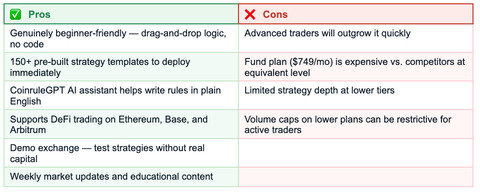 The template library contains 150+ pre-built rules, meaning you can deploy a strategy immediately without designing one from scratch. Coinrule also supports on-chain DeFi trading on Ethereum, Base, and Arbitrum — a feature very few competitors offer at any price tier.