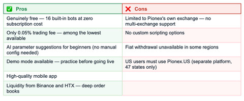 Exchanges: Pionex native (aggregates Binance & HTX liquidity)