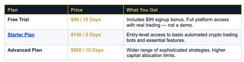 Most platforms let you start with as little as $100. SaintQuant's $99 10-day trial includes a $99 bonus credit — making the effective cost minimal. For grid bots on Pionex, there's no minimum subscription cost at all, just the 0.05% trading fee.