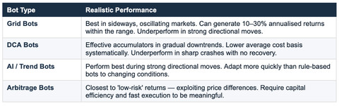 It depends entirely on strategy quality, market conditions, and risk management. A well-configured grid bot in a sideways market can generate consistent returns. A poorly configured bot in the wrong market regime can lose money faster than manual trading. Treat automation as a tool — not a guarantee.